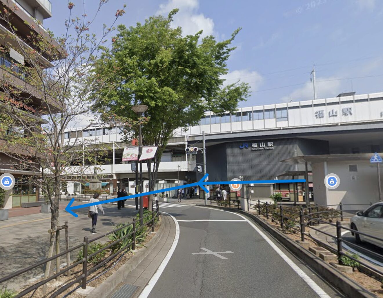 ①福山駅南口、駅を背に右手方向をバスロータリー沿いに進みます。