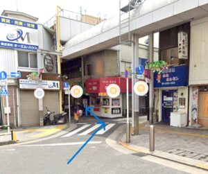 ②駅を背にロータリー右手側、商店街に入ります。(目印:松屋のある方)